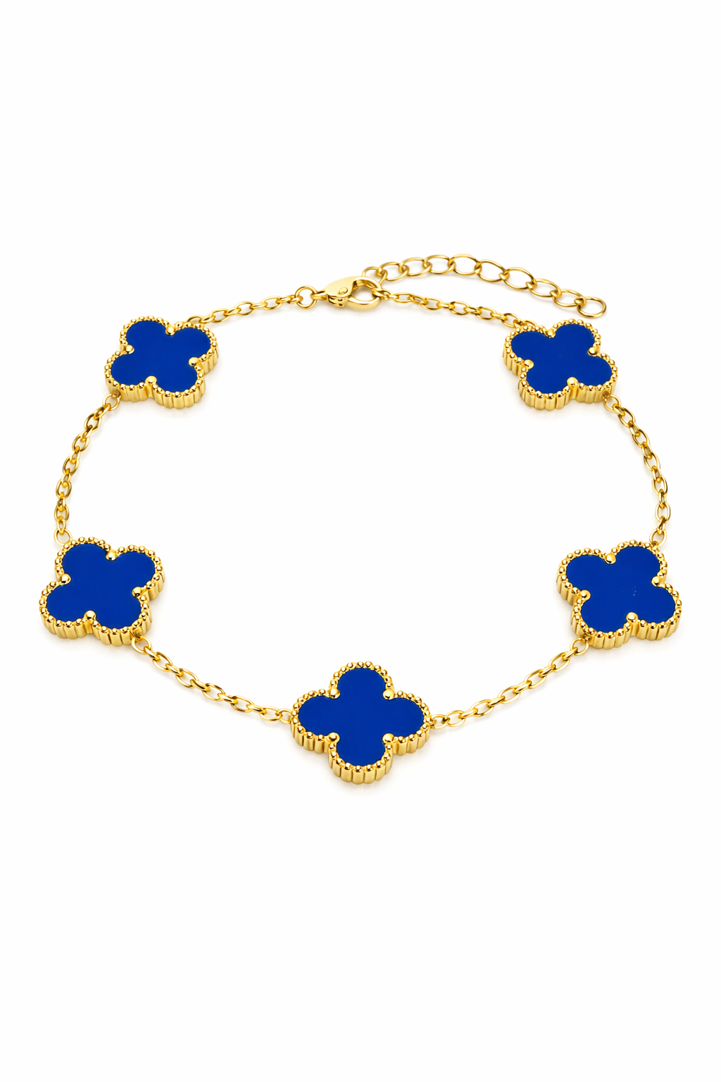 Brățara Trifoi Regal Albastru adaugă un aer elegant și rafinat oricărei ținute, prin designul său cu simboluri tip trifoi și nuanța albastră intensă.